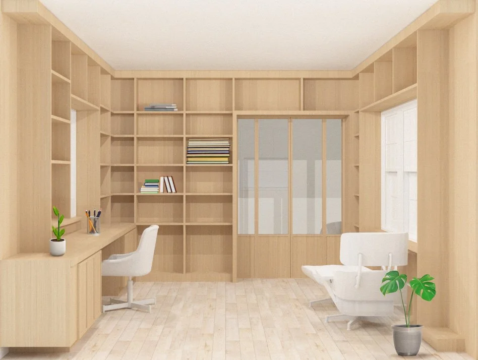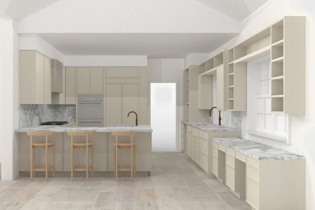 The Ashland Avenue project is a phased interior renovation of a traditional home in upstate New York. The first phase focuses on updating secondary spaces, including the kitchen, entry/mudroom, laundry area, living room, and a former office now converted into a library. The client wanted a Japandi-inspired feel with muted tones and light colors. The design blends modern elements with the home’s traditional character, using a simple, textured palette of white oak, vintage brass, channeled glass, and roman clay plaster. Floors were refinished, with dark oak lightened and existing limestone tiles restored.