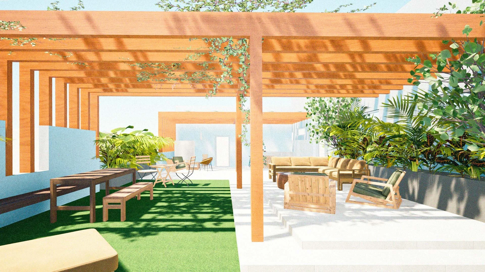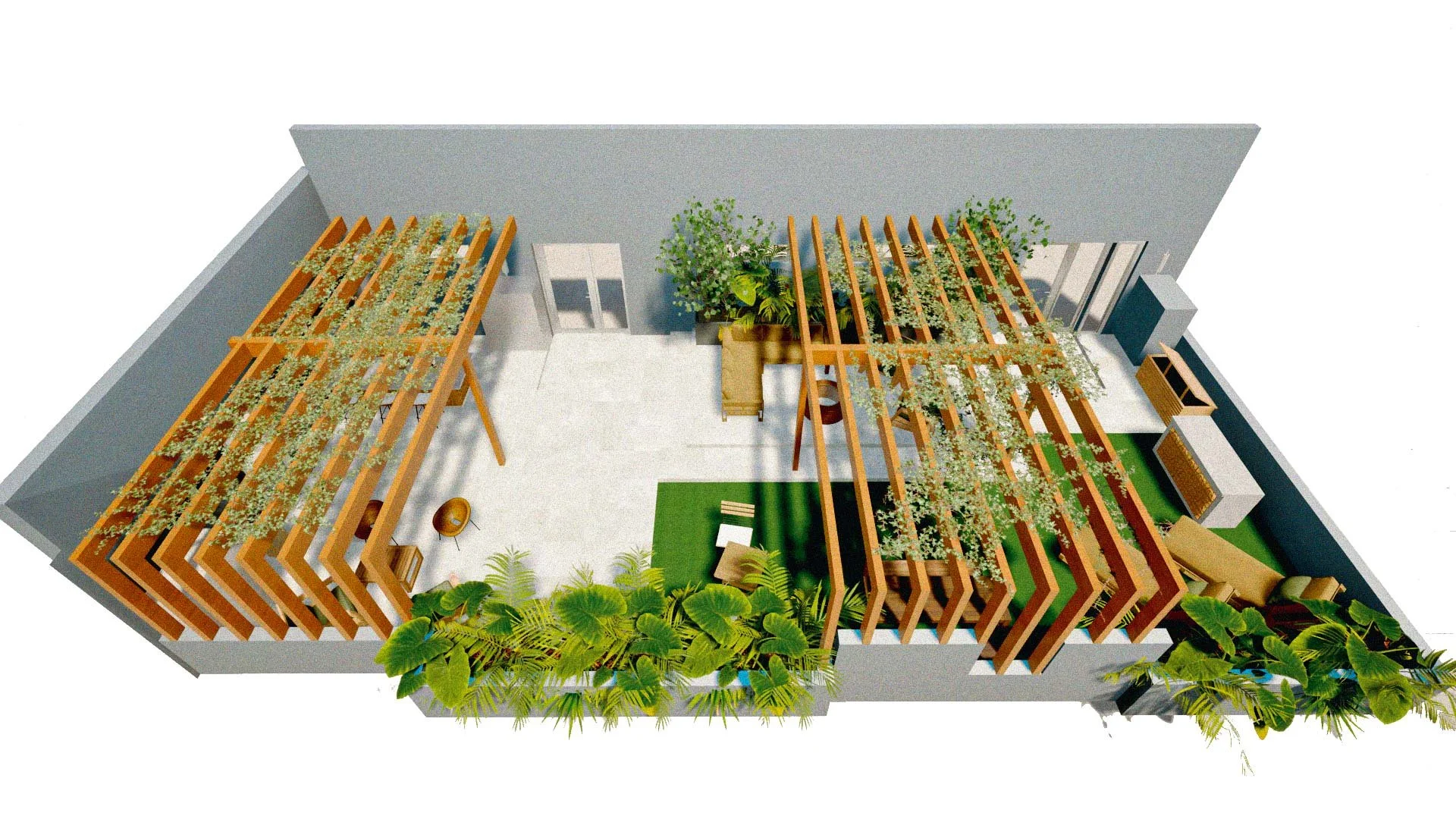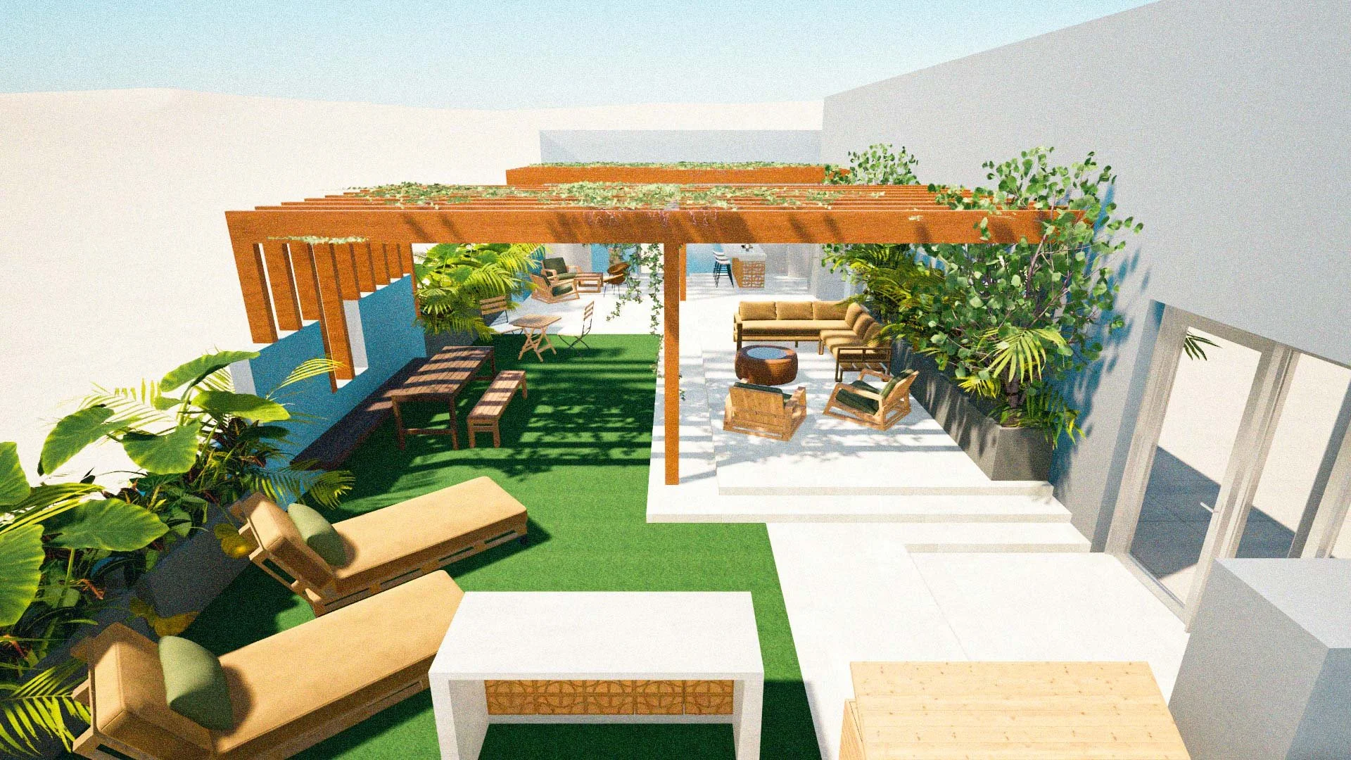 The rooftop serves as a natural extension of the apartment, offering distinct zones for relaxation and entertaining, with elements like a built-in grill, bar seating, and lush plantings.